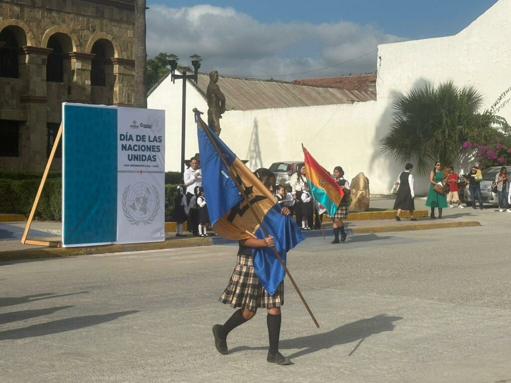 Múzquiz, Coahuila.– El Gobierno Municipal de Múzquiz, que preside la alcaldesa Laura Jiménez Gutiérrez, en coordinación con la Dirección de Acción Cívica, a cargo de la profesora Mireya Jordán, llevó a cabo la ceremonia conmemorativa por el 80º aniversario de la creación de la Organización de las Naciones Unidas (ONU).