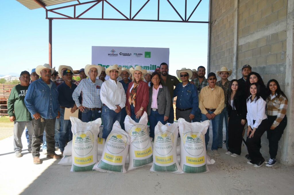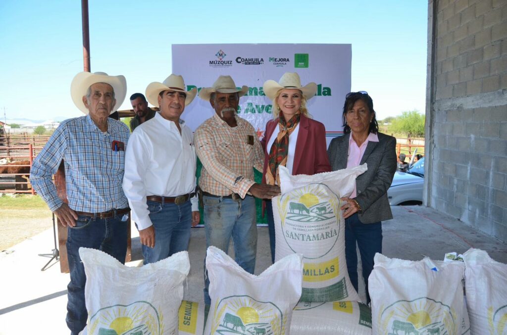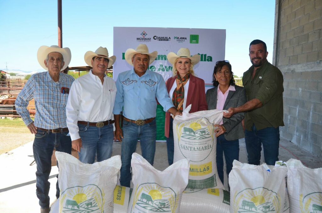 Con el propósito de fortalecer la actividad agrícola y apoyar a las familias del campo, la alcaldesa Laura Jiménez Gutiérrez, en compañía del Subsecretario de Desarrollo Rural, Diego Elguezábal, el Director de Desarrollo Rural Municipal, Javier Gutiérrez, y la Regidora Amparo Flores Morín y Juan Francisco Gonzalez Ortiz, llevó a cabo la entrega de semilla de avena ciclo otoño–invierno en el municipio de Múzquiz.