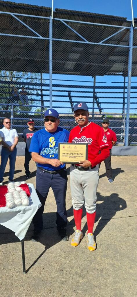 En el presidium también estuvieron presentes Enrique Zamarrón, Sergio Ocura, Sebastián Villanueva, Luis Alberto Pecina y Artemio Marentes, junto a otros peloteros de gran trayectoria que han dejado huella en el béisbol de la región.