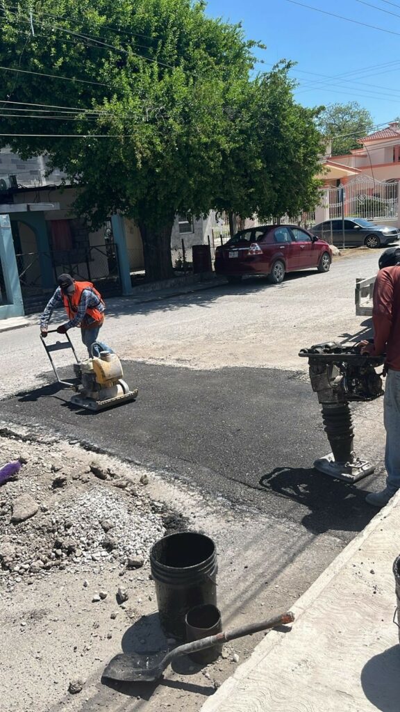 Asimismo, una tercera cuadrilla continúa con la rehabilitación de la carpeta asfáltica en la calle Francisco Murguía, en el tramo comprendido entre las calles Lucio Blanco y 5 de Febrero, dando seguimiento a las acciones de mantenimiento en vialidades clave.